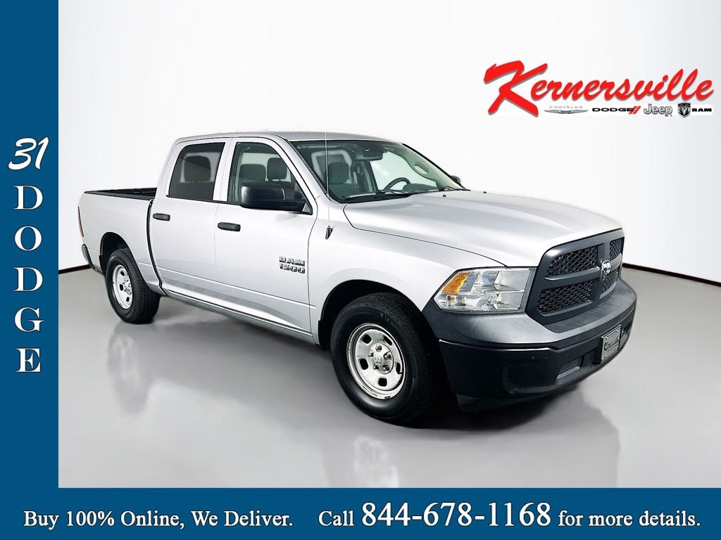 2016 Ram 1500 Tradesman 2WD Crew Cab in Bright Silver Metallic Clearcoat with Diesel Gray/Black interior is powered by the 3.6L V6 24V VVT engine paired with an 8-speed automatic transmission and features Quick Order Package 22B Tradesman, Popular Equipment Group, Uconnect 5.0 radio with integrated voice command and Bluetooth, remote keyless entry with All-Secure, cruise control with steering wheel controls, spray-in bed liner, wheel to wheel side steps, cloth 40/20/40 split bench seat, black rotary shifter, electronic shift, active grille shutters, auto on/off halogen headlamps with delay-off, deep tinted glass, rear folding seat, front armrest with three cupholders, media hub with USB and Aux inputs, pickup cargo box lights, cargo area concealed storage, stability control, advanced multistage front airbags with supplemental seat-mounted and side curtain airbags, rear child safety locks, tire pressure monitoring system, and Sentry Key immobilizer for added confidence and security.